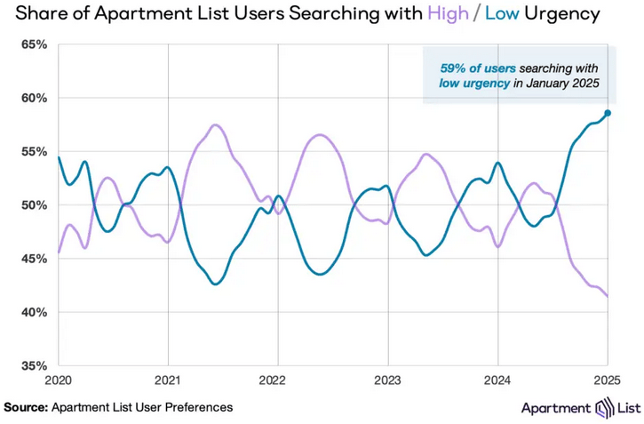 59% of renters now search with low urgency, the highest rate ever recorded by Apartment List, signaling a major shift in leasing dynamics. Property managers must adapt to extended decision cycles to maintain occupancy.