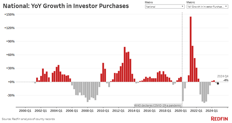 Investor Purchases Decline: In Q4 2024, investor activity fell 3.9% year-over-year, marking the lowest level since 2016. This drop is largely due to high home prices, elevated mortgage rates, and economic uncertainty.