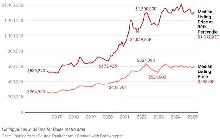 150% Surge in Luxury Prices – Boise, ID, leads the nation in luxury home price appreciation, with high-end home prices skyrocketing 150% since 2017. The top-tier market now sees listings averaging nearly $1.3 million, outpacing major metros like NYC and LA.