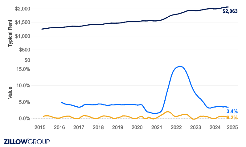 Cooling Rental Market: Rental demand softened in August as new multi-family units hit the market, leading to slower rent growth and increased concessions. Monthly rents rose by just 0.2% to $2,063, reflecting a cooling trend from previous years.